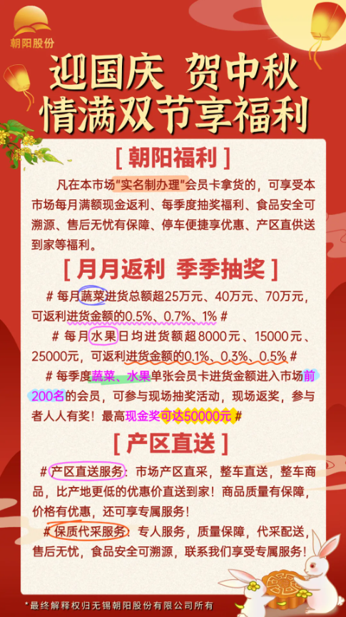 國慶旗將紅,中秋月漸圓! 雙節(jié)同慶的熱鬧里, 怎么少得了新鮮水果的甜? 朝陽水果批發(fā)市場 雙節(jié)專屬促銷已上線, 為你的團(tuán)圓宴、走親禮 備好滿滿 “果” 力!           想給家人朋友送心意?市場能定制水果禮盒! 挑好新鮮菜果,搭配成盒,體面又健康! 中秋走親戚、國慶訪好友,拎著超有范兒。 而且市場早早就為雙節(jié)做足準(zhǔn)備,不僅新增了清晰的引導(dǎo)標(biāo)識,還掛滿了鮮艷的紅旗與節(jié)日橫幅,紅綢隨風(fēng)飄動,果香伴著喜慶,一進(jìn)市場就能感受到濃濃的雙節(jié)氛圍,采購時連心情都跟著熱鬧起來! 這個雙節(jié),囤新鮮、享優(yōu)惠、送好禮,就來朝陽農(nóng)產(chǎn)品大市場,讓新鮮菜果,把節(jié)日氛圍拉滿! (供稿:張柯宇) |