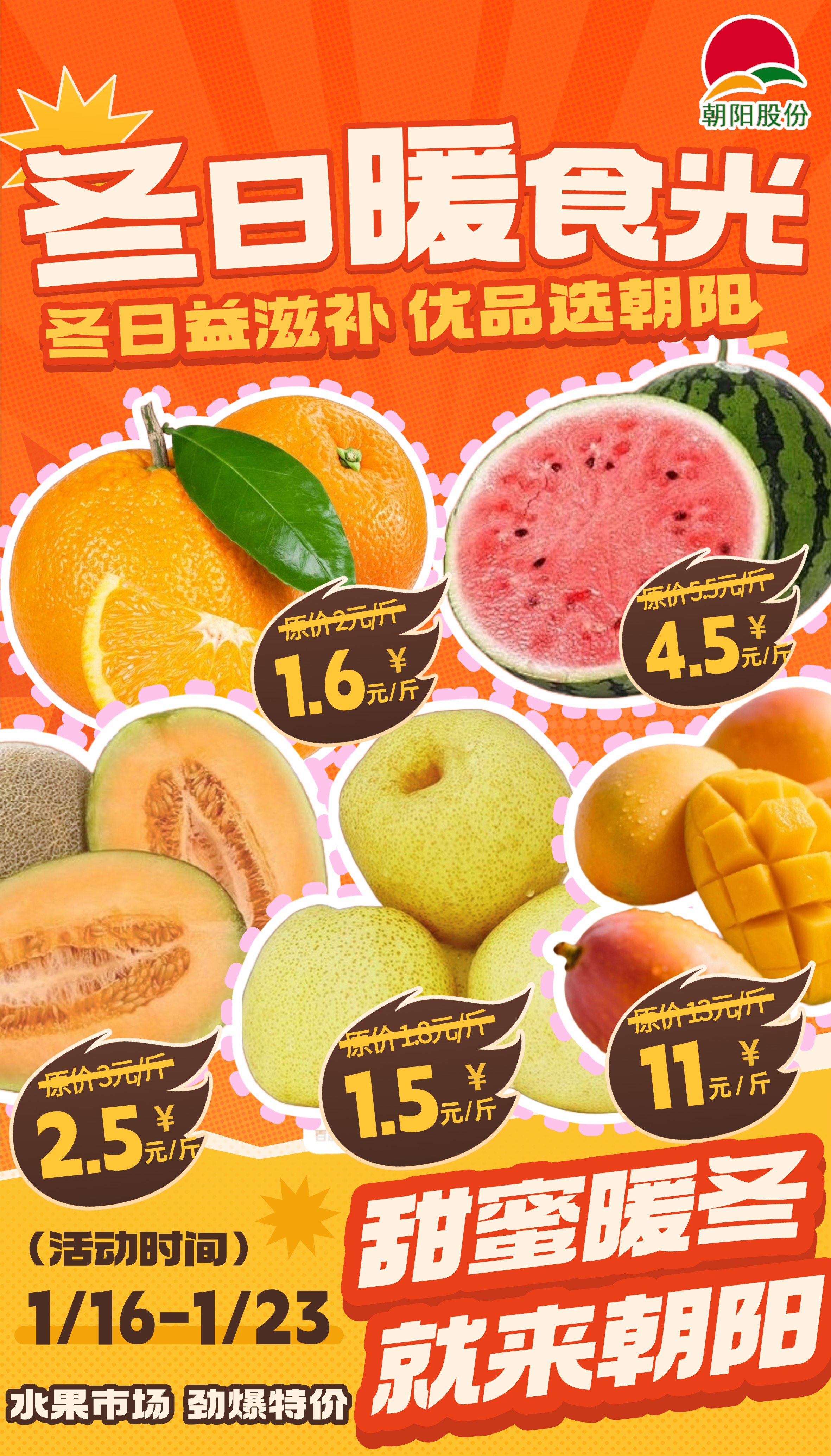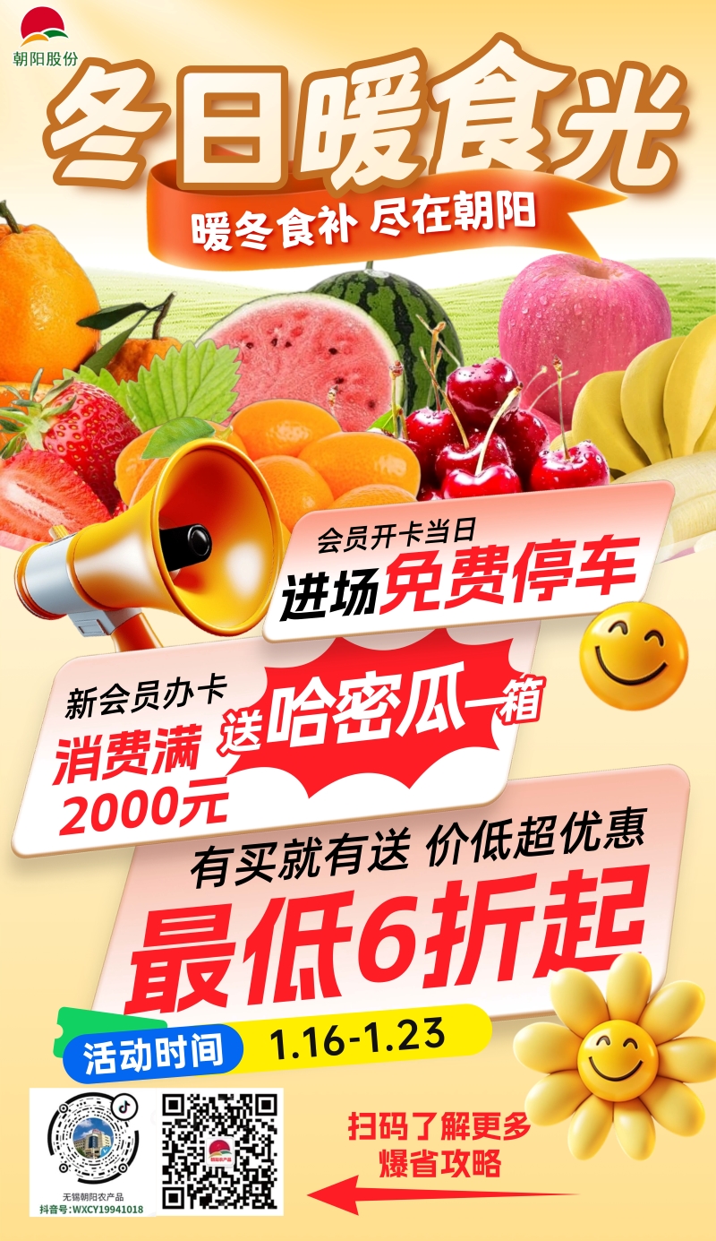 寒風(fēng)凜冽,暖食暖心!當冬日的煙火氣遇上實打?qū)嵉牟少徃@?,幸福感直接拉滿!朝陽農(nóng)產(chǎn)品大市場“冬日暖食光”蔬果促銷活動溫情啟幕,1月16日-1月23日,精選當季優(yōu)質(zhì)蔬果,全場促銷價均低于行情價,勁爆讓利不停歇,為你承包整個冬日的新鮮與實惠!
